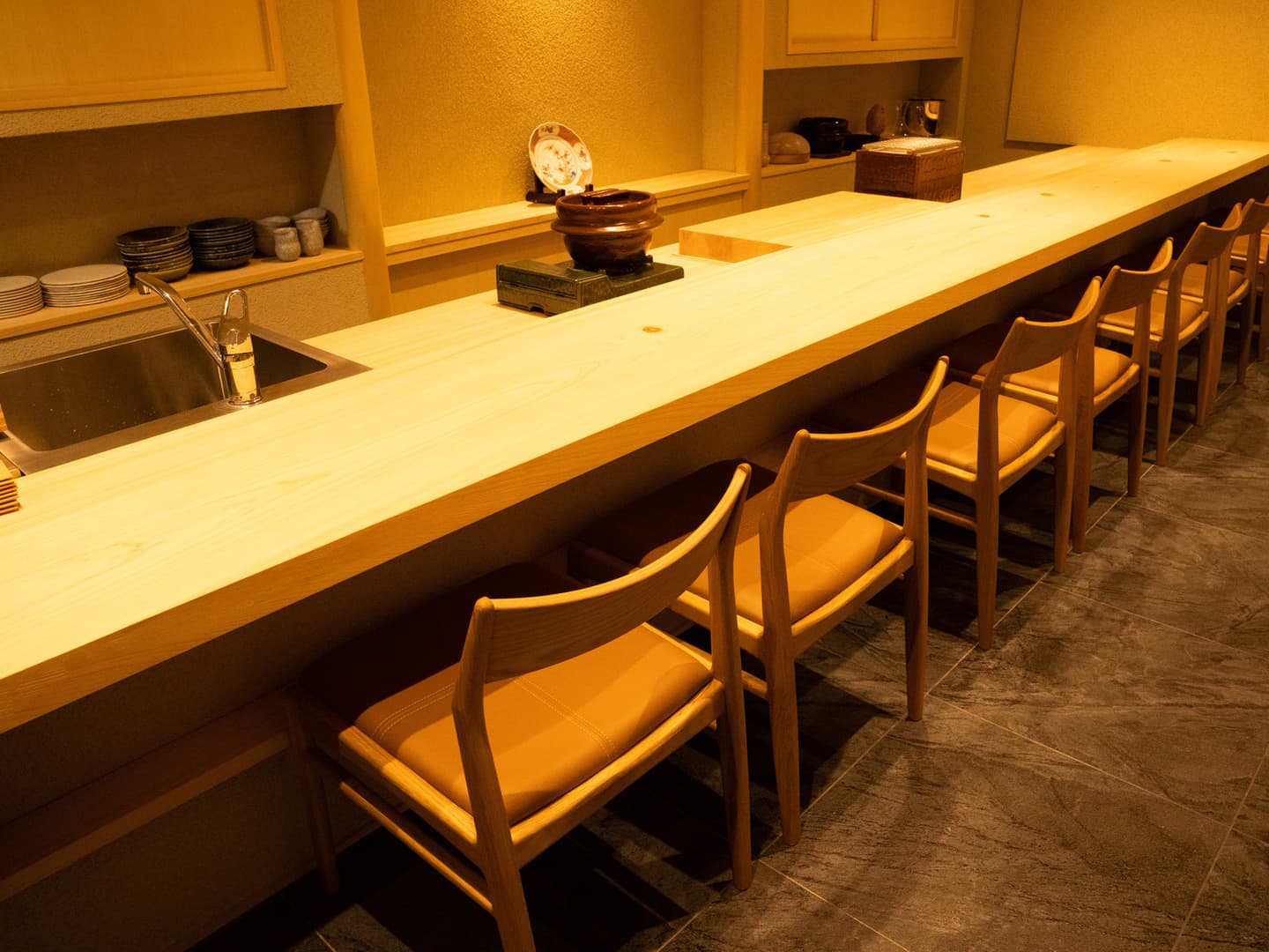 純和風の落ち着いた店内。6メートルを超えるカウンターは最高級柾目の桧一枚板を使用。